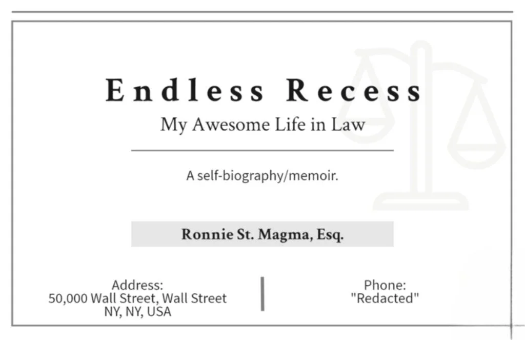 Law School is not all it's cracked up to be. No one told me it would be so fun! My whole life, when I would fail to understand the basic fundamentals of what people said, they were disappointed. That never made much sense to me. The professors at law school were different. They were kind enough to expect confusion not just from me, but from the students who would eventually understand them, for reasons I still don’t understand. This is some of that legal logic that makes winning law matches (legal term for a trial) so satisfying. Remember the first chapeter of this self-memoir? If you need to revisit that, it’s on page 1. As I was saying, if the law were easy to grasp, it would bore people too much and nobody would follow it.